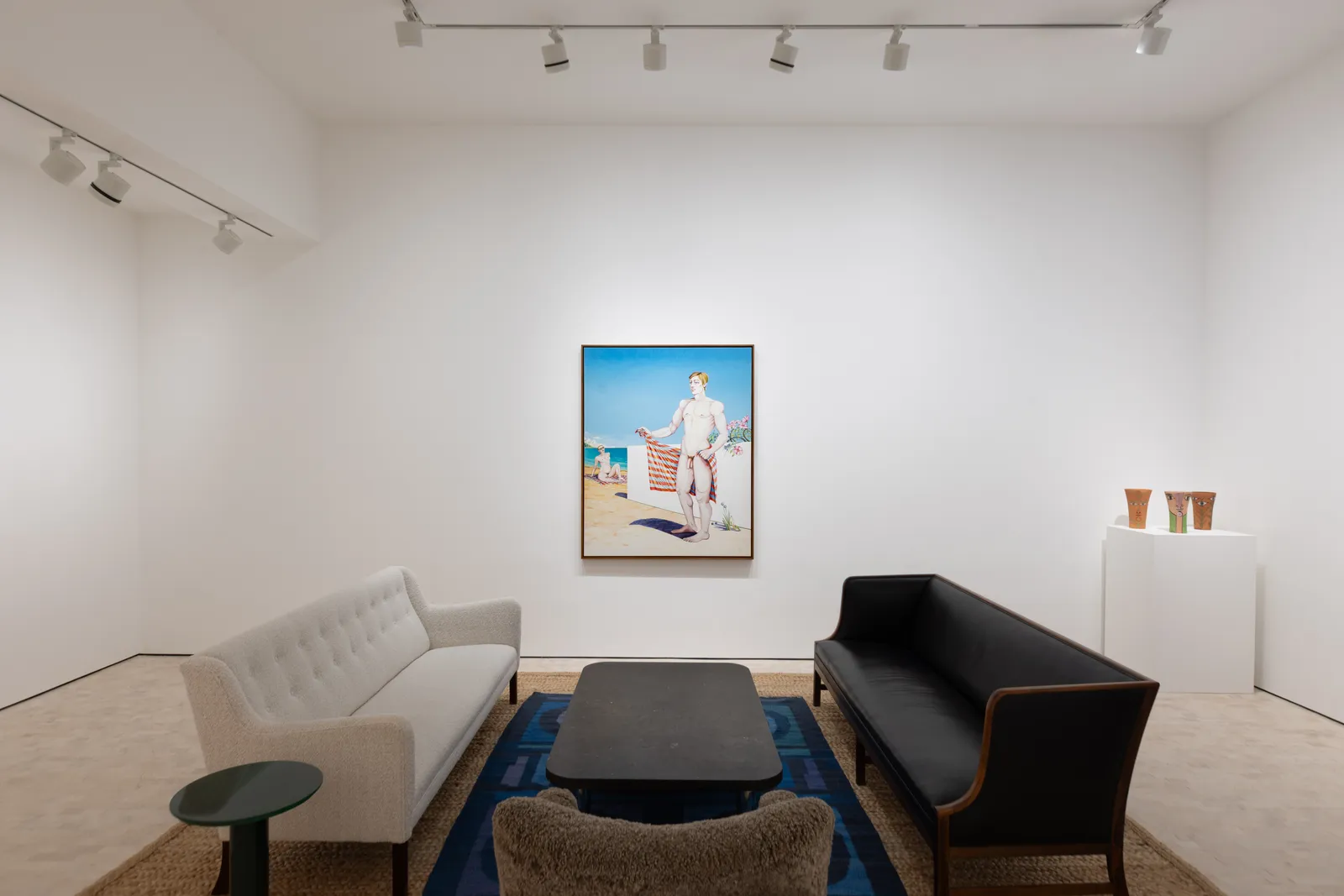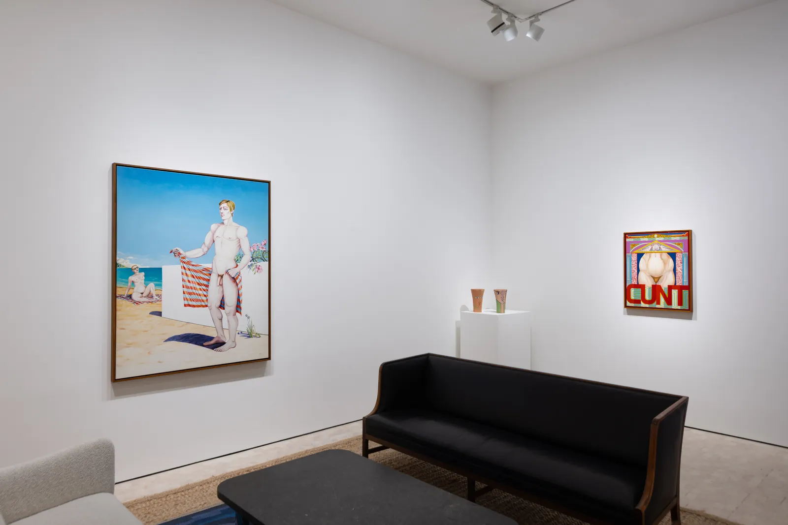 Inspired by feminism and the politics of sexual liberation, Coon’s unique paintings contest binary notions of gender and oppressive patriarchal values. In Self Portrait with Model, Coon depicts herself naked with paintbrush in hand, standing in front of her aroused male model. This work was painted in the same year as Mr Olympia – a large-scale nude in which Coon subverts Édouard Manet’s Olympia (1863), replacing the naked white woman with a Black man, and the clothed Black servant girl with a naked white woman. Deemed offensively explicit, this work was pulled from an exhibition at Tate Liverpool for the presence of an ‘ithyphallus’.