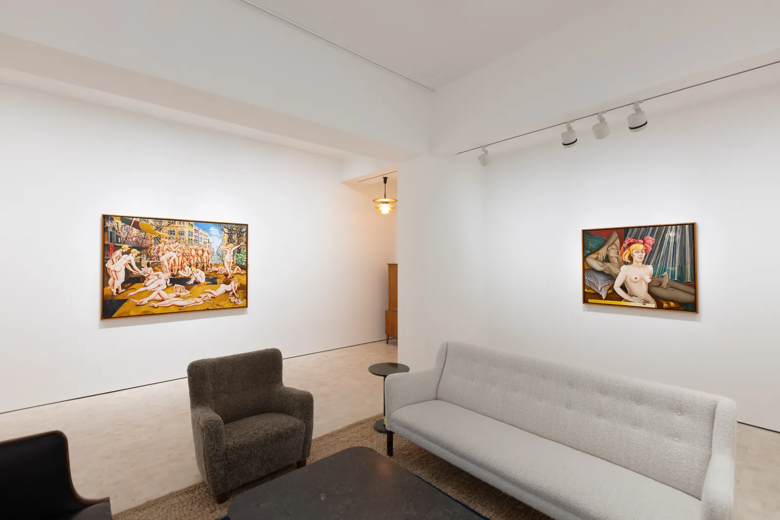 Women of Ladbroke Grove – Carnival is an ode to female friendship and Notting Hill carnival – London’s “annual bacchanal”, as the artist describes it, while Cunt is a richly symbolic tribute to Pauline Boty and a bold celebration of female sexuality. In See, He is Absolutely Gorgeous!, a male subject dominates the foreground of a paradisial landscape. Coon considers this work as “a manifesto about the reality of female libido.” The paintings and photographs in the exhibition are united by Coon’s unwavering rebellion against the status quo.