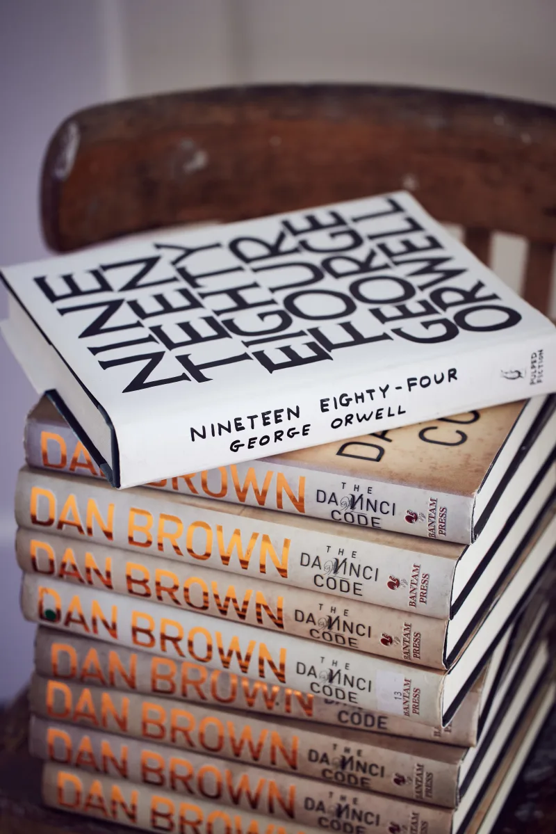 In 2017, a charity bookshop in Swansea, UK made headline news as a result of exhibiting several hundred copies of Dan Brown's 2003 novel 'The Da Vinci Code' in its window with a sign requesting that no more copies of the book be donated as they had more than they could sell. 'Pulped Fiction' is a project by visual artist David Shrigley, who has produced a limited run of 1,250 copies of George Orwell's dystopian novel 'Nineteen Eighty-Four' made entirely from the pulped remains of unwanted copies of 'The Da Vinci Code'.