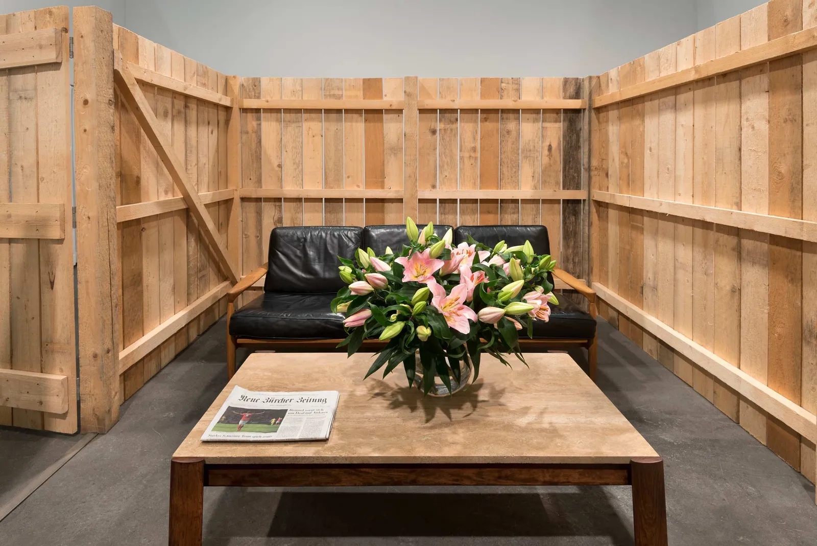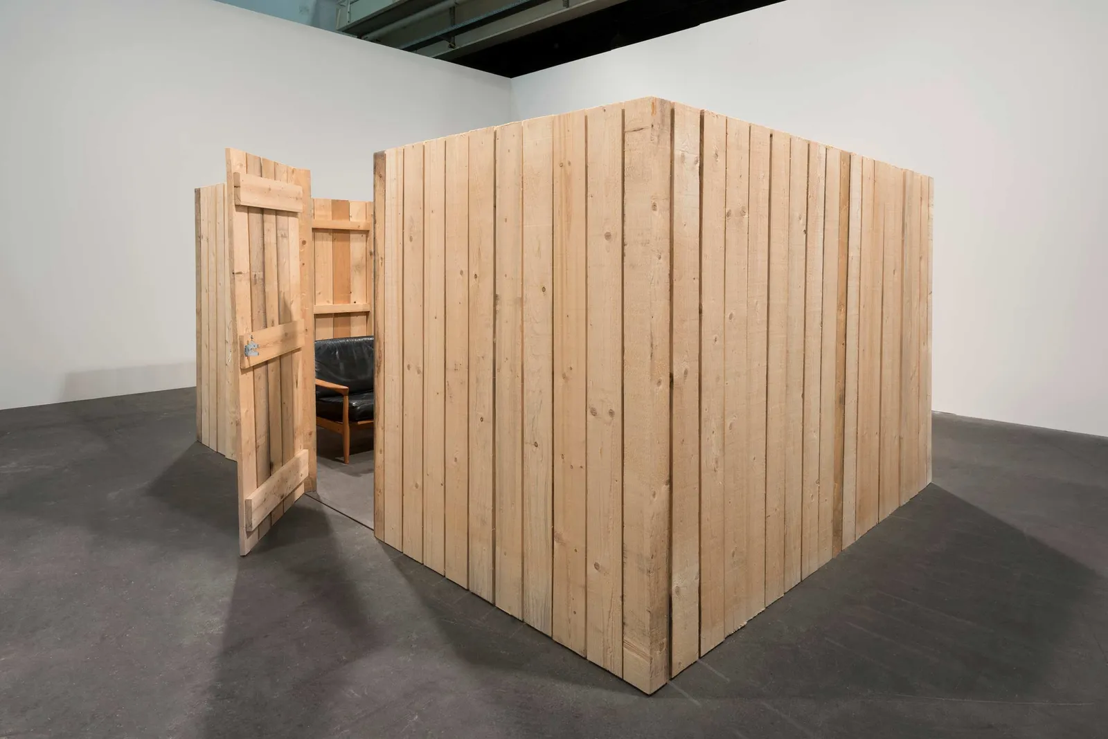 'a good fence' is an immersive installation exploring notions of boundaries, liberation and contemplation. Visitors will encounter a two meter high pine fence which acts as both an excluding barrier and a safe haven. Visitors cannot see through its tightly locked wooden panels, save for one discreet door. Once through the entrance, the environment is transformed from an impenetrable fortress into a tranquil oasis. Two sofas and a coffee table invite us to congregate with one another or offer the opportunity for quiet contemplation-a space to retreat and reflect. First presented at Stephen Friedman Gallery in 2008, the work keys into Hodges' multi-media practice exploring and exploiting everyday materials. Hodges talks of his practice as 'choreographing experiences', and 'a good fence' is a prime example of his investigations into both space and materiality. Our expectations are subverted just as the material too is transformed by the artist's touch, from a simple fence to a meditative temple.