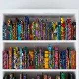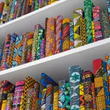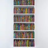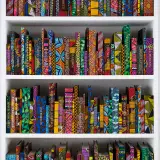 196 Hardback reclaimed books covered in Dutch wax Batik fabric, gold foiled names, wooden shelves and index box