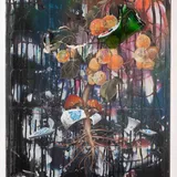 Acrylic spray, ink, gouache, and beermats on linen with glass