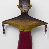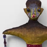 Wood, acrylic, leather, soft vinyl, thread and brass