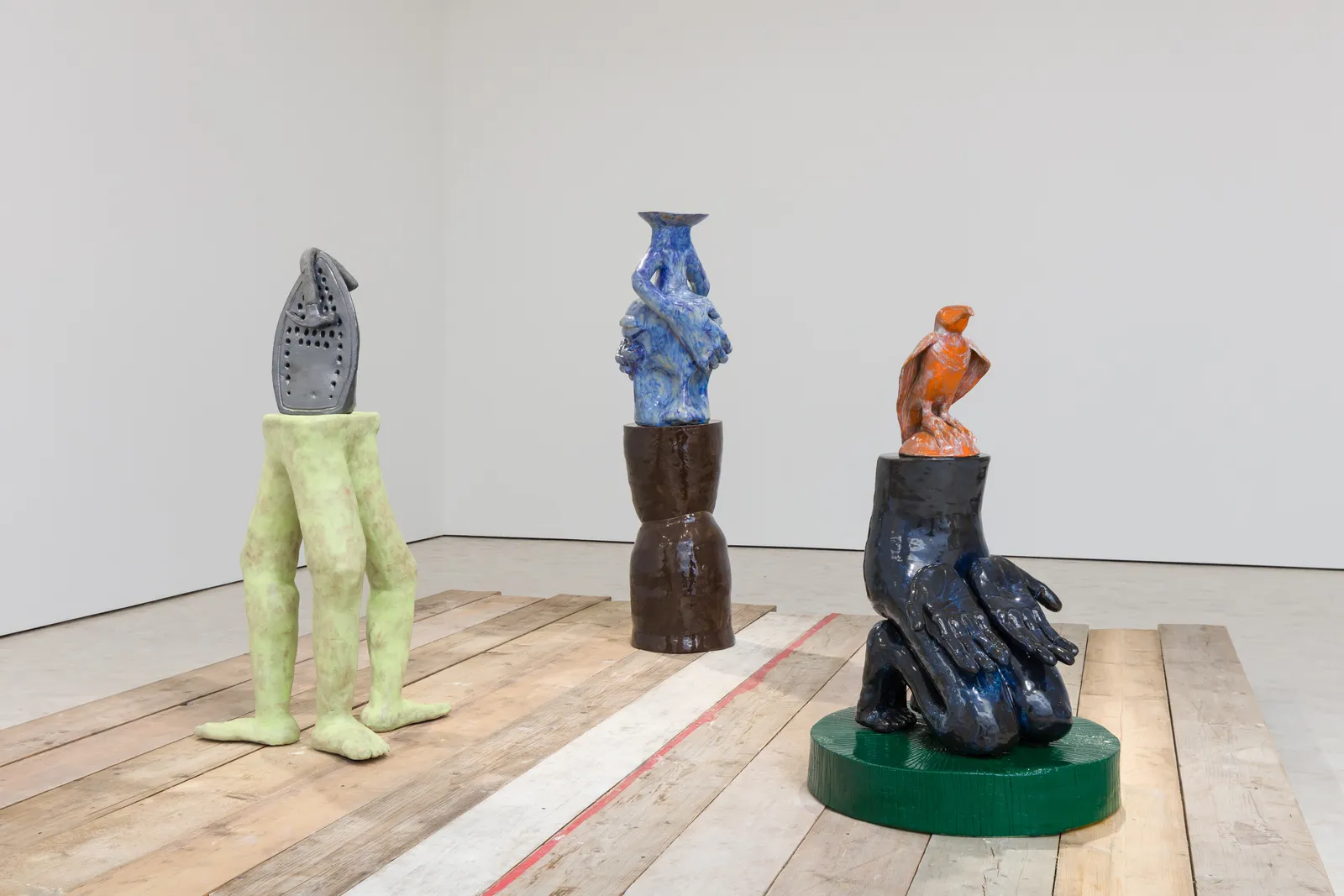 The exhibition unfolds as a series of mise-en-scène with each room transformed into a unique environment. In one room, sculptures float on a trio of rafts made from shipping palettes. Kneeling figures inspired by the prostrate bodies seen across ancient religious statuary—from Djenné-Djeno's famous seated figures to Egyptian depictions of pharaohs—are joined by a congregation of vessels aptly titled 'the healers gathered around' (2023). Atop this base of criss-crossed legs, several vessels are arranged, featuring rich blue, green, and grey elongated faces. Instead of facing the viewer, the figures huddle inward. A pair of falcons perch on another buttress of limbs, a reference to the Yoruba belief in a divine force connecting earth to the spirit world as well as the ancient Egyptian god Horus often depicted as a falcon-headed man.