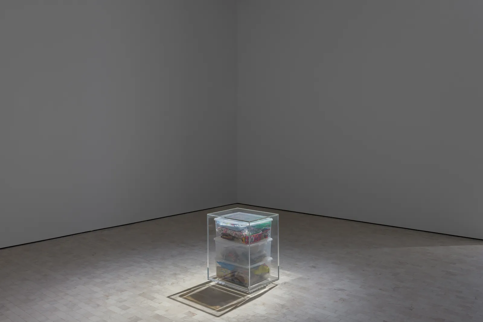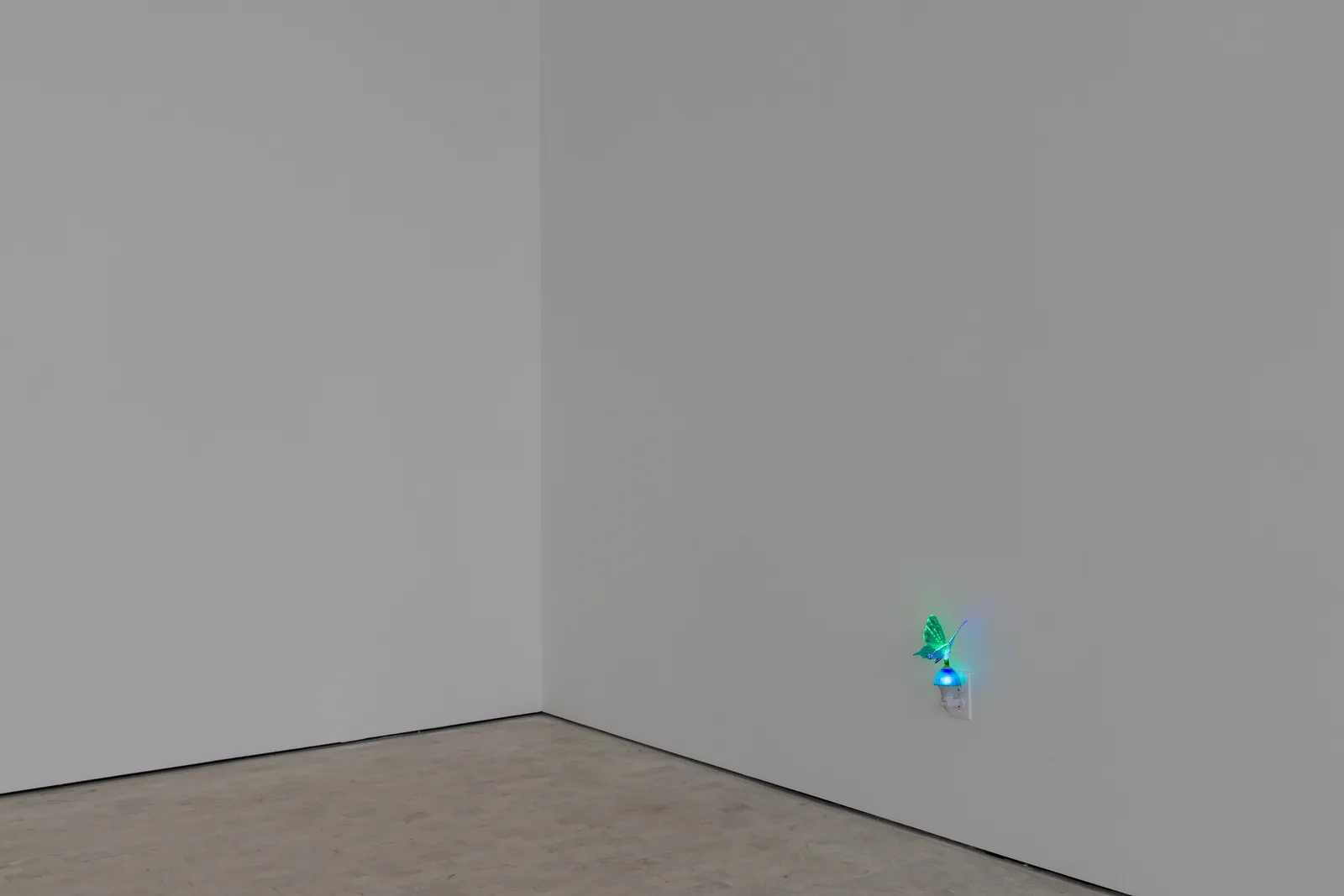 Shifting from playful contrasting weights and tempos, from light reflections in polished marble to the twinkling wings of a butterfly night light, the exhibition moves next to a darker terrain where we are met with shadows and suggestions of memories and times long past. It only takes a minute draws the viewer along a path that concludes in the dimming light of the last gallery where we come upon a mysterious, looming garage space. This murky, sensual apparition, rescued from the Louisiana bayou, is a musky and erotic threshold for the senses and our imaginations to cross. There we encounter an archive of materials in a spectrum of patinas that build to create a double portrait of a father and his son.