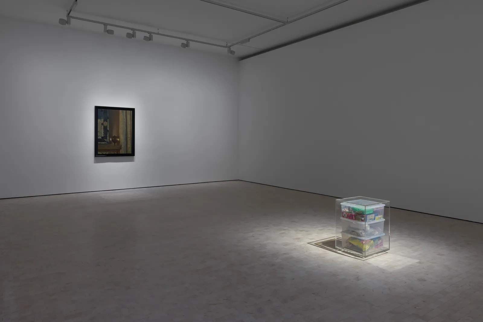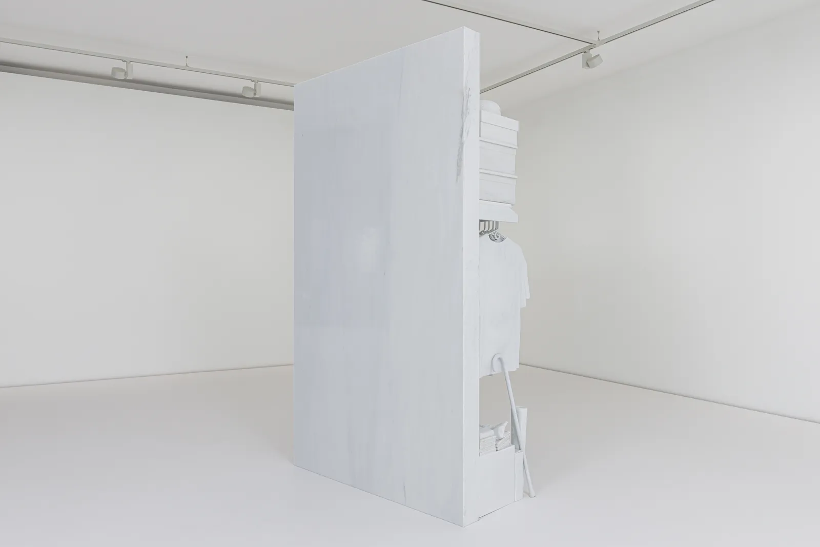 Rendered in white marble and painted bronze, the familiar, modest gathering of intimate belongings to be discovered in Craig’s closet have been captured in time. Even as they speak of the specific world, and the specific life in which these objects – clothing, keepsakes, closed forever containers – were brought together, they seem to now transcend their temporal materiality.