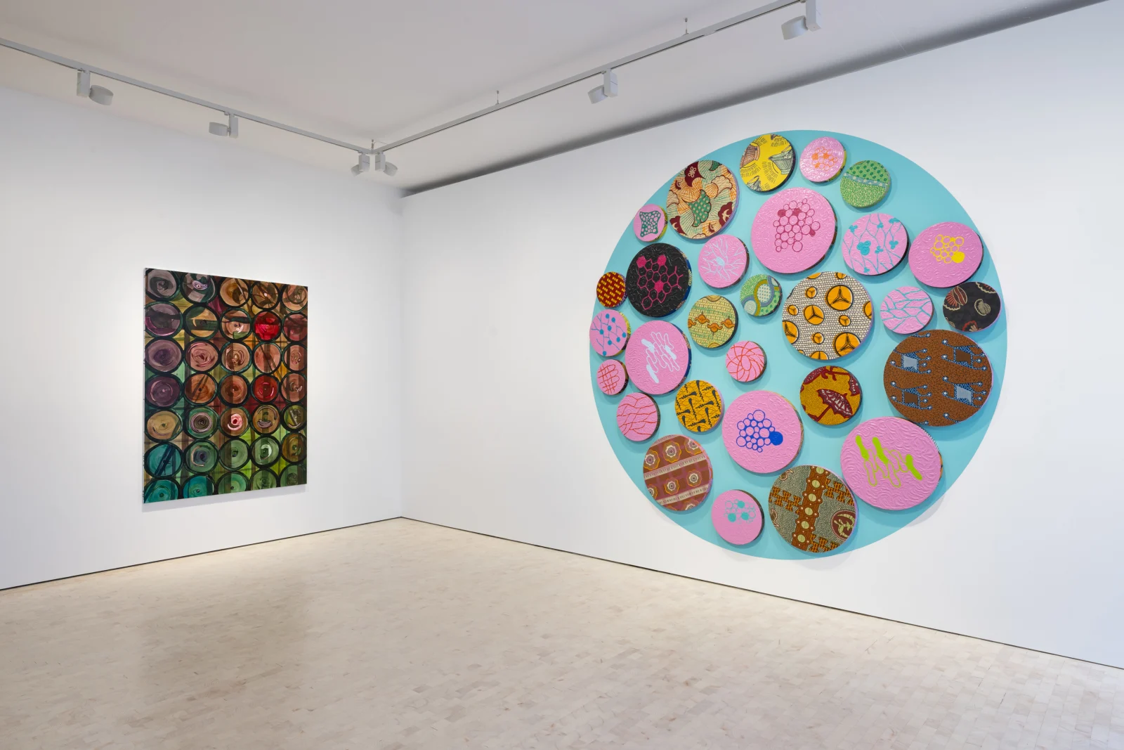 Trackwalker (2025) by Clare Woods explores the luminous beauty of stained glass, drawing inspiration from the historic architecture of Pitzhanger Manor & Gallery in London. Rendered with translucent washes of paint, the painting captures Woods’ ongoing fascination with the symbolic and material qualities of windows, acting as thresholds between public and private, light and dark, seen and unseen. Woods' radiating, circular forms resonate with Yinka Shonibare’s Web Painting (2003) – an intricate and visually opulent painting installation. A circular stretch of turquoise — over three metres in diameter — serves as a background to twenty-nine individual panels of alternating ‘African' Dutch batik canvases and heavily gestured paint. Accompanying this work, an important mural installation Little Rich Girls (2010) comprises fifteen children’s dresses in spectacularly clashing batik fabrics – a playful vision of joyful excess, laden with complex socio-political undertones.