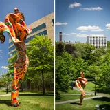 'Wind Sculpture (SG) V', 2019 by Yinka Shonibare CBE employs Dutch wax textiles to visualize the idea of capturing the volume of wind. Constructed of industrial materials, the monumental, hand-painted 22-foot-high sculpture is based on photographs of wind being blown into the actual batik fabrics. 'Wind Sculpture (SG) V' was previously installed on the Rose Kennedy Greenway in Boston, and other sculptures from the series have been installed in locations around the world, including Trafalgar Square, London; Central Park, New York; Ndubuisi Kanu Park, Lagos, Nigeria; Smithsonian National Museum of African Art, Washington, DC; and Davidson College, North Carolina.