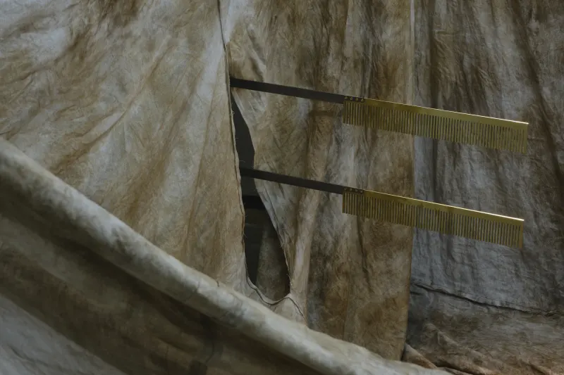 In this exhibition Barclay includes a series of tactile sculptural environments, where large-scale forms, made predominantly from fabrics and metals, “suggest textile narratives and explore our complex relationships with cloth.”