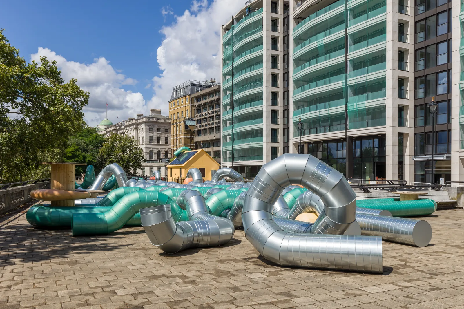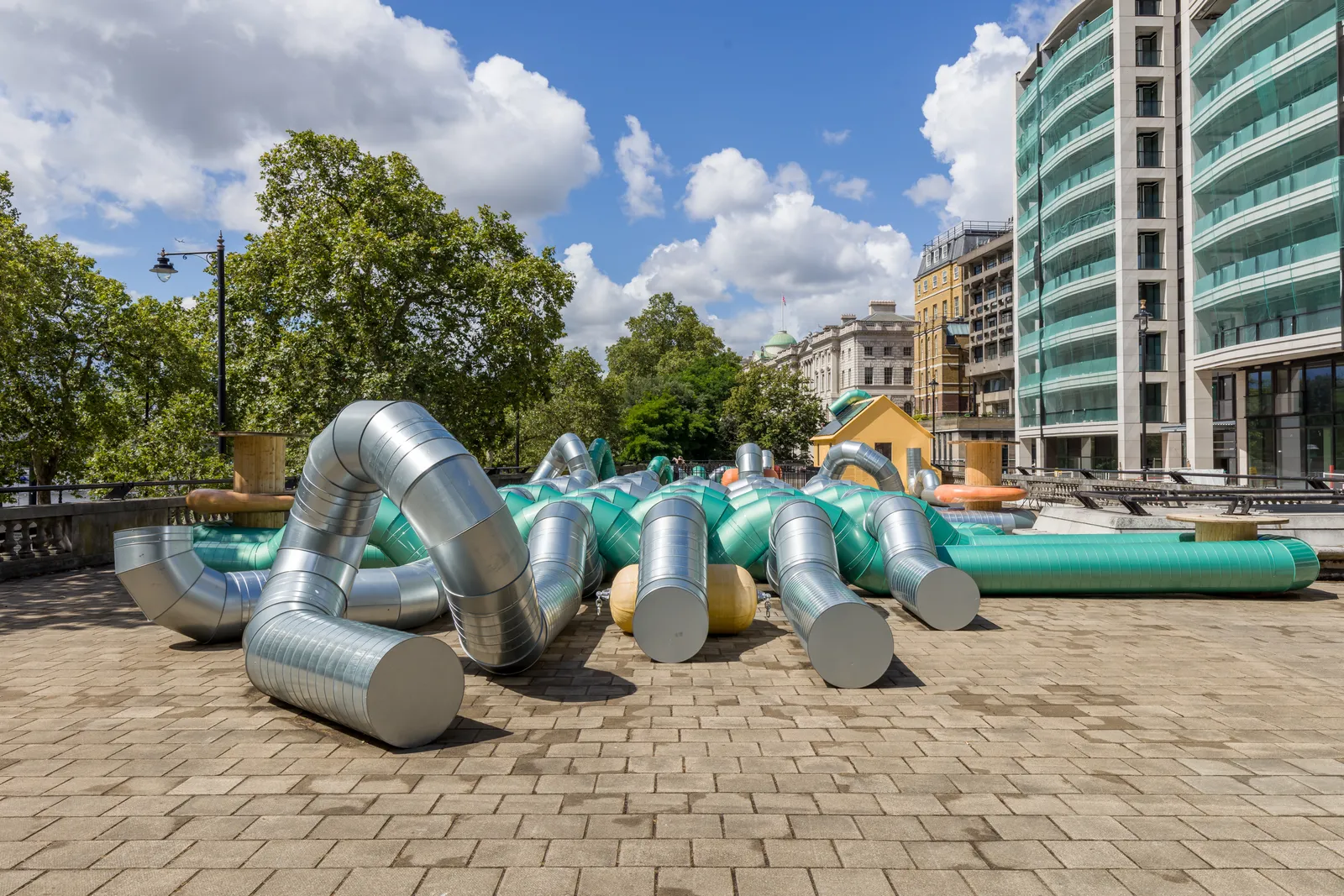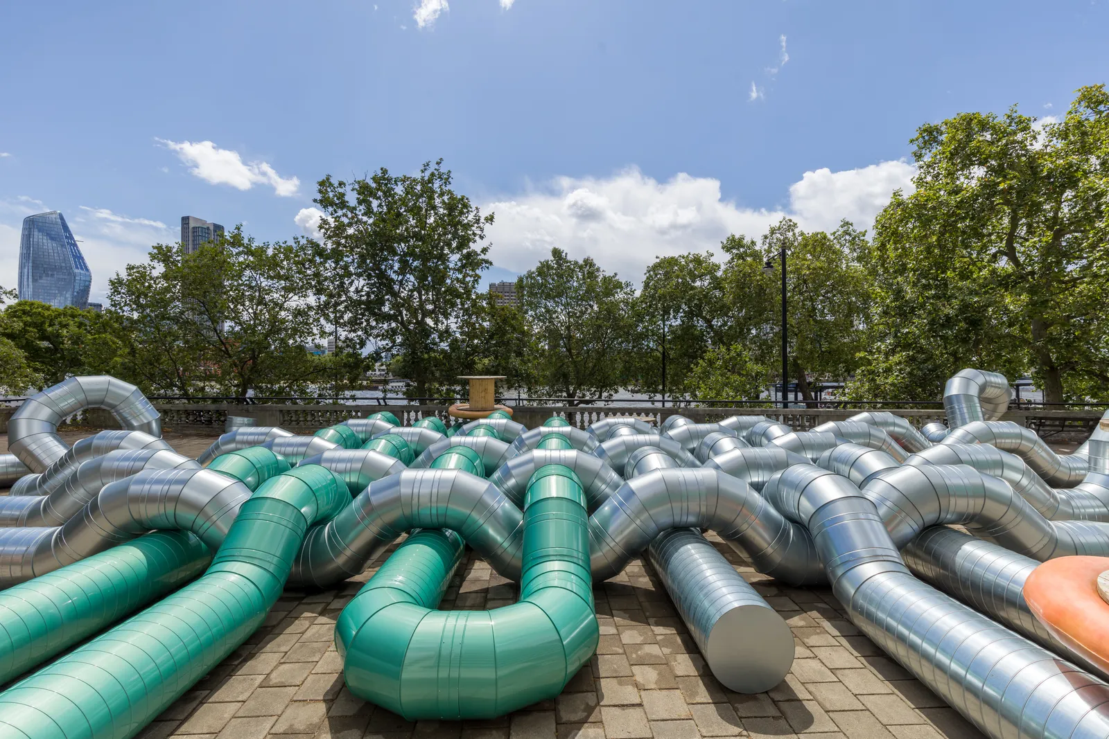 'Slackwater' is Holly Hendry’s first public commission in London and her most expansive to date. Curated by Claire Mander for The Artist’s Garden, this site-specific work occupies the vast terrace on the roof of Temple Underground station. The project continues theCoLAB’s dedication to commissioning innovative contemporary installations by women artists within this unique, half-acre site. The Artist’s Garden has been realised in close partnership with Westminster City Council since 2021.