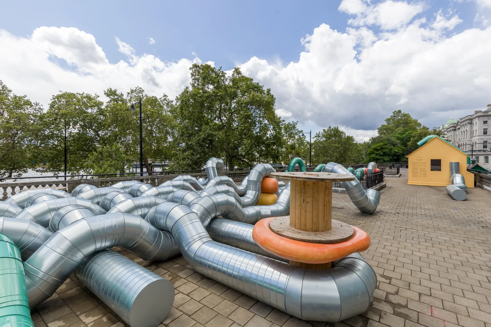 'Slackwater' emerges as an immense sculptural entanglement that weaves together the watery history of its riverside location, with references to the abstract rhythms of the Thames and liquid movements within the human body. In conceiving the work, Hendry was drawn to changes in the pattern of the river’s surface; after slackwater, when an incoming tide meets the fluvial flow, water stills, and then eddies – whirlpooling against the main direction of the flow – before pursuing its course upstream. Constructed with industrial-scale ducting, curled around electricity spools and over casts of inflated boat fenders, the work ebbs and flows across the site’s architecture. The artist’s visual language brings together both scientific research and cartoon imagery. Its pastel tones and exaggerated forms are drawn from ancient depictions of floods and rivers, and 19th century microscopic images of Thames water, described as ‘monster soup’, a bacterial slurry teeming with surreal, animated forms.